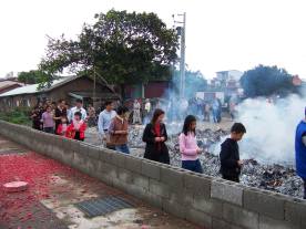熊熊烈火瞬間竄燒起來,大約五分鐘後,整間庫屋即化為灰燼。等高溫稍降後,道士再次帶領家族成員繞走數圈,儀式便接近尾聲了。